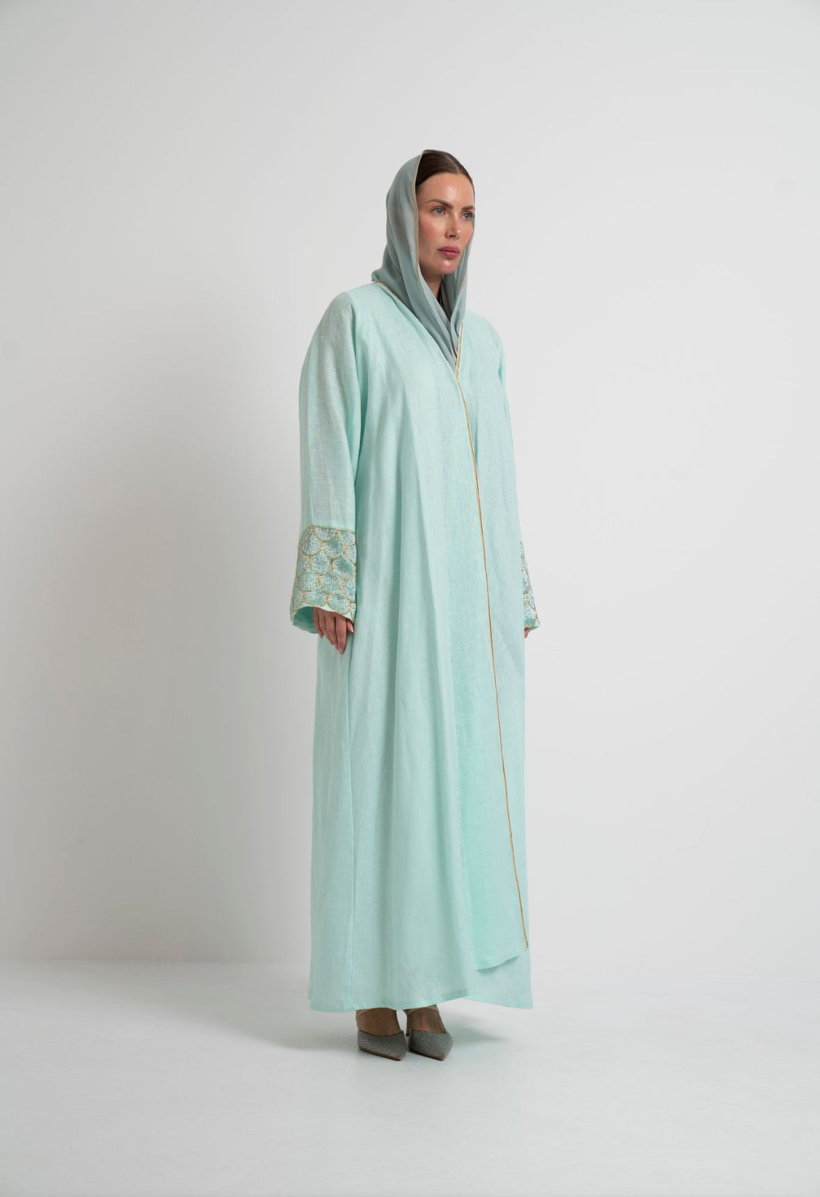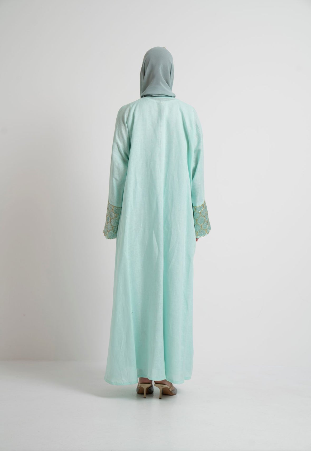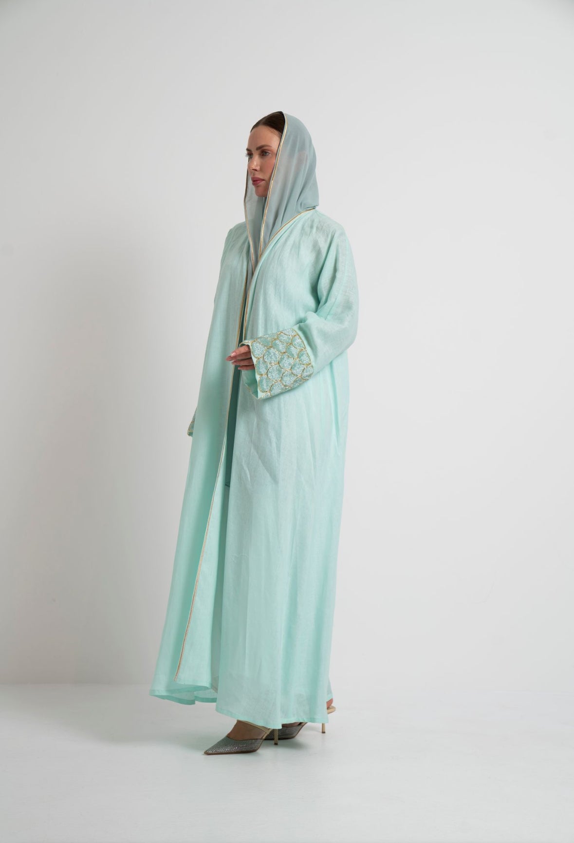 Abaya: This elegant baby blue abaya is crafted from soft linen, offering a graceful flow and luxurious texture. It features delicate hand-embellished beadwork on the sleeves in a shimmering combination of silver and baby blue, adding a refined touch to the overall design.