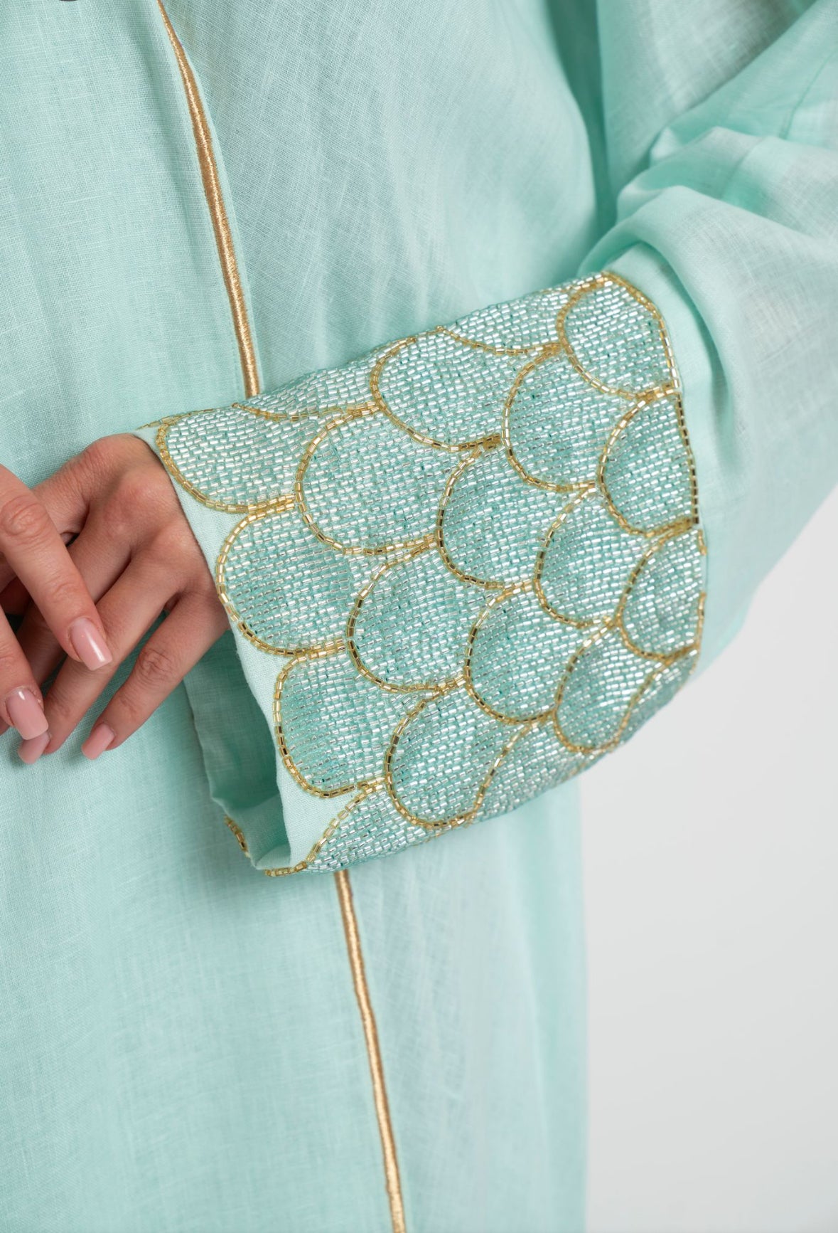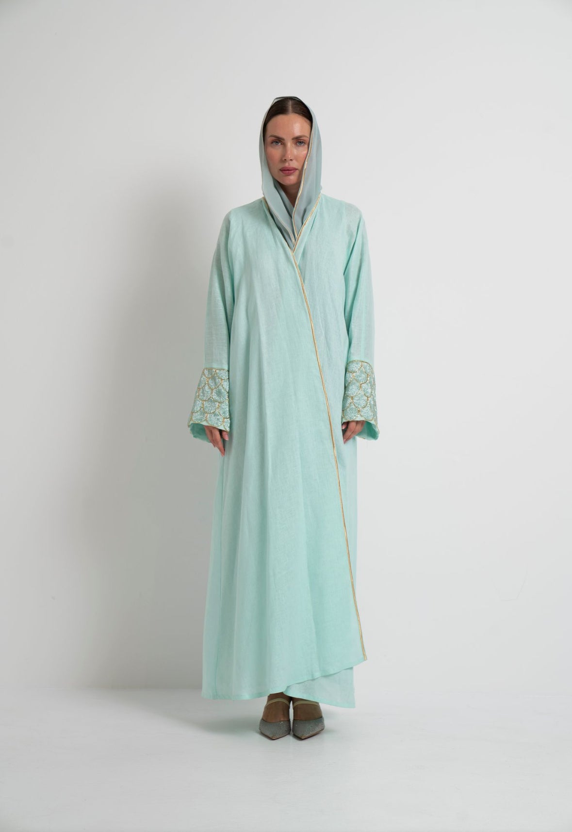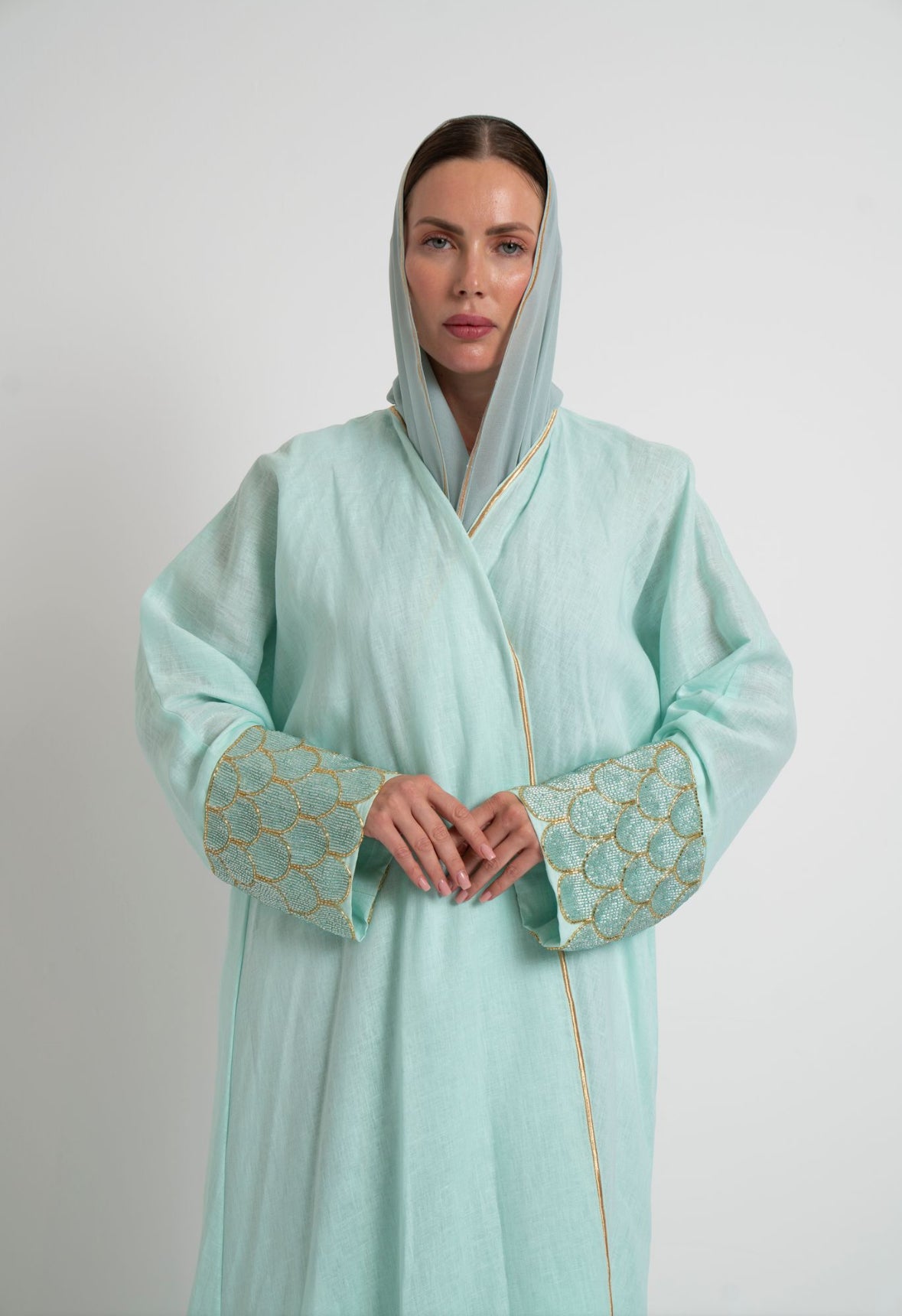 Abaya: This elegant baby blue abaya is crafted from soft linen, offering a graceful flow and luxurious texture. It features delicate hand-embellished beadwork on the sleeves in a shimmering combination of silver and baby blue, adding a refined touch to the overall design.