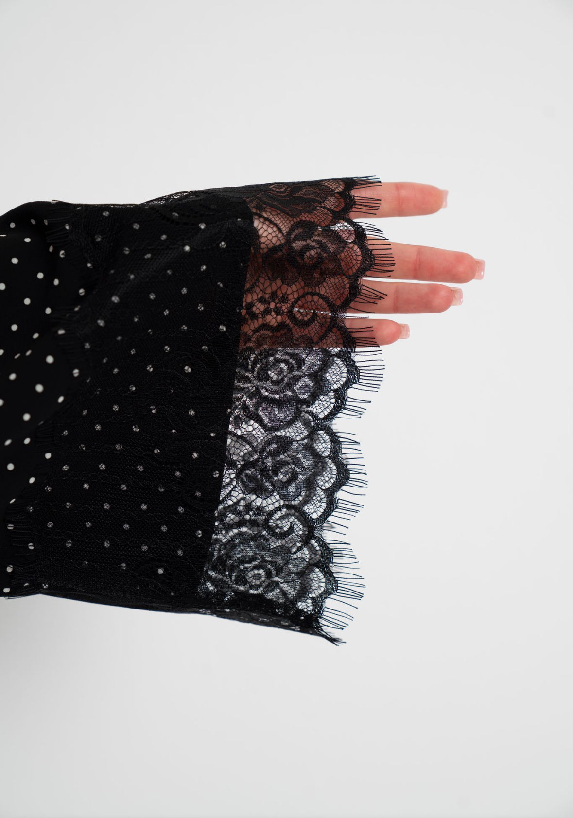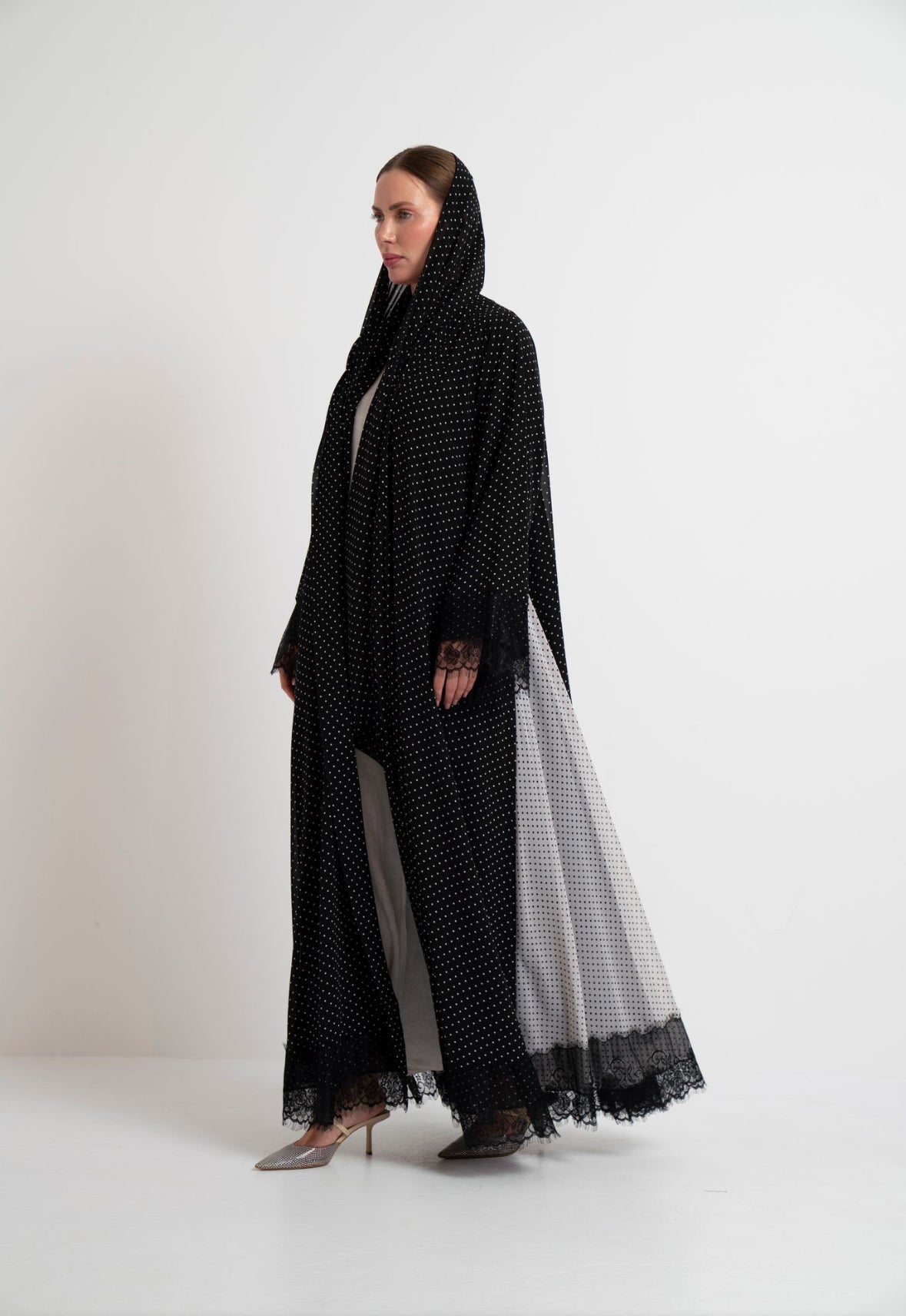 عباية شيفون سوداء منقطه بأبيض كلوش مع دانتيل